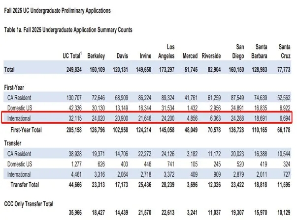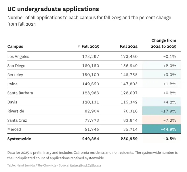 根据UC官网公布的数据来看,2025Fall加州大学9个分校共有249,824人提交了申请,比2024Fall的250,959人减少了0.5%。