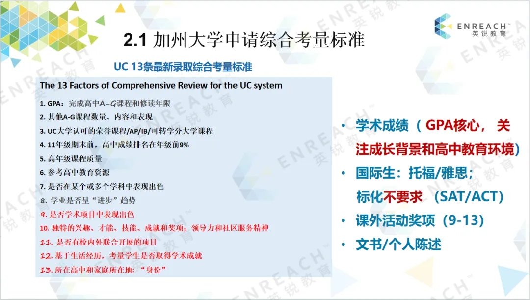 我们接来看一下加州大学系统13条最新录取综合考量标准。