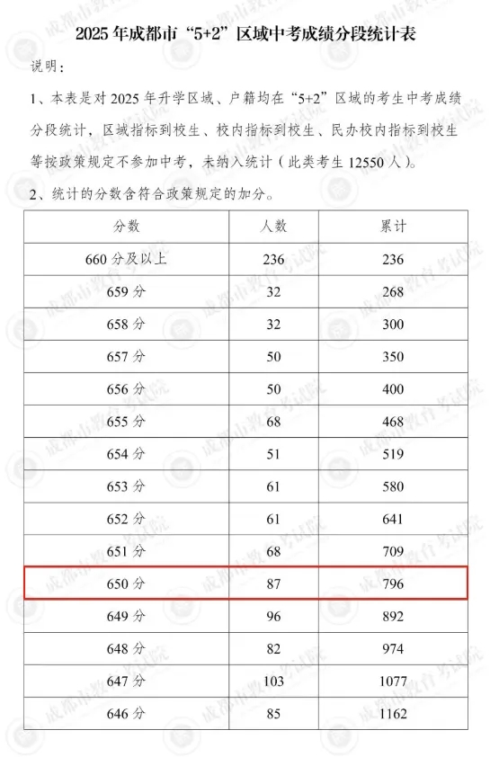 2023 年,成都中考 650 分及以上的人数为 385 人;到了 2024 年,这一数字下降至 195 人;2025 年,650 分及以上有 796 人 。