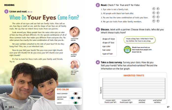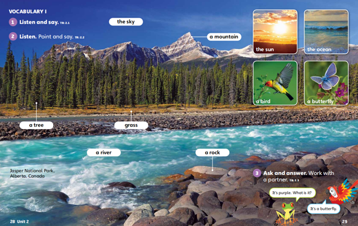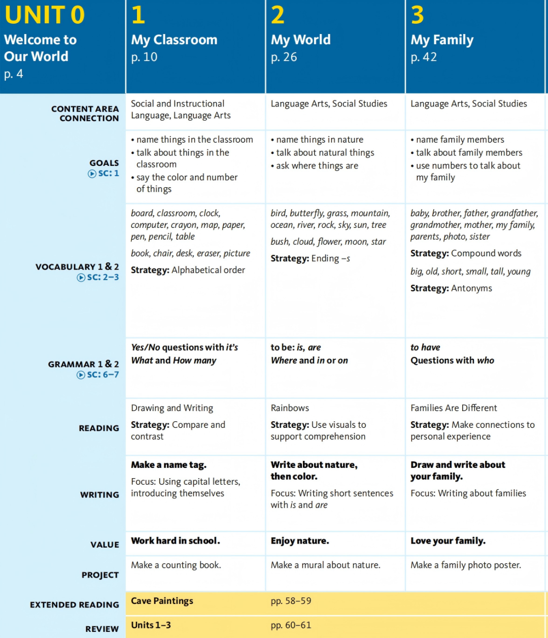 每个单元,老师都将从有趣的游戏引导学生进入课堂,学习词汇、语法、阅读、写作,并通过课堂内容传递正确的价值观,如在学校好好学习(U1 My Classroom)、享受大自然(U2 My World)、爱家人(U3 My Family)。