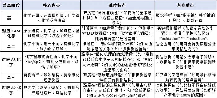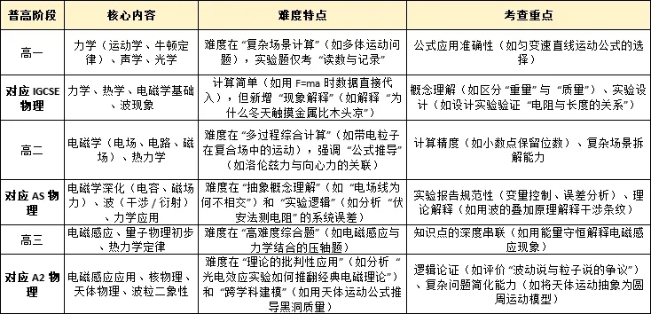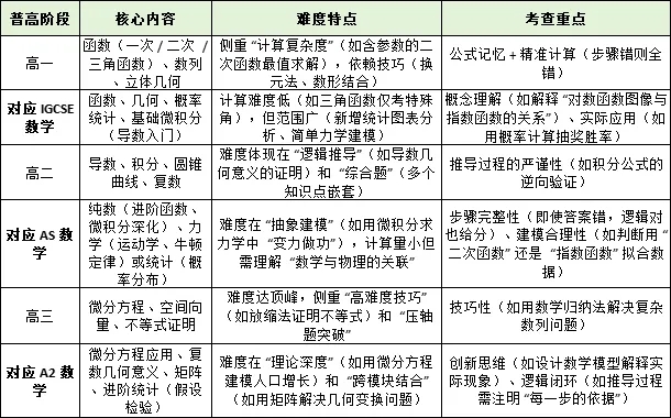 A-level 体系通常分为:IGCSE(9-10 年级,对应普高初一至高一)→ AS(11 年级,对应普高高二)→ A2(12 年级,对应普高三)。以下按 “普高年级→A-level 对应阶段” 对比核心学科的难度与考查重难点: