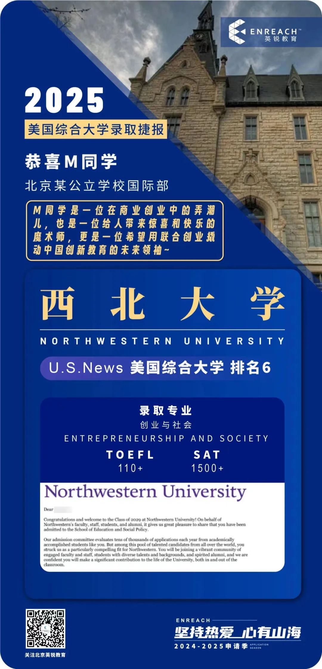 我其实是在ED阶段就申请西北大学,结果被Defer了,而且那个时候也已经知道ICC有两名同学已经被西北录取了,一直觉得自己大概率可能不会在RD被捞上岸了,所以真的收到转正的Offer时的心情特别激动、特别开心。从ED阶段开始,我就以真诚的方式向西北大学展现了我的热情与潜力,即便在收到Defer决定后,我依然全力以赴:精心撰写的Love Letter不仅更新了我的学术进展和创业项目成果,更附上了我用魔术展现个人特点的Video Essay,相信西北大学的招生官最终被我的真诚和执着所打动。总结一下就是,要有抗压的能力,做各种事情都要拼尽全力,不后悔!