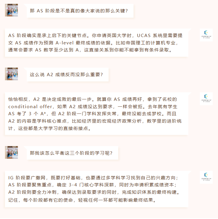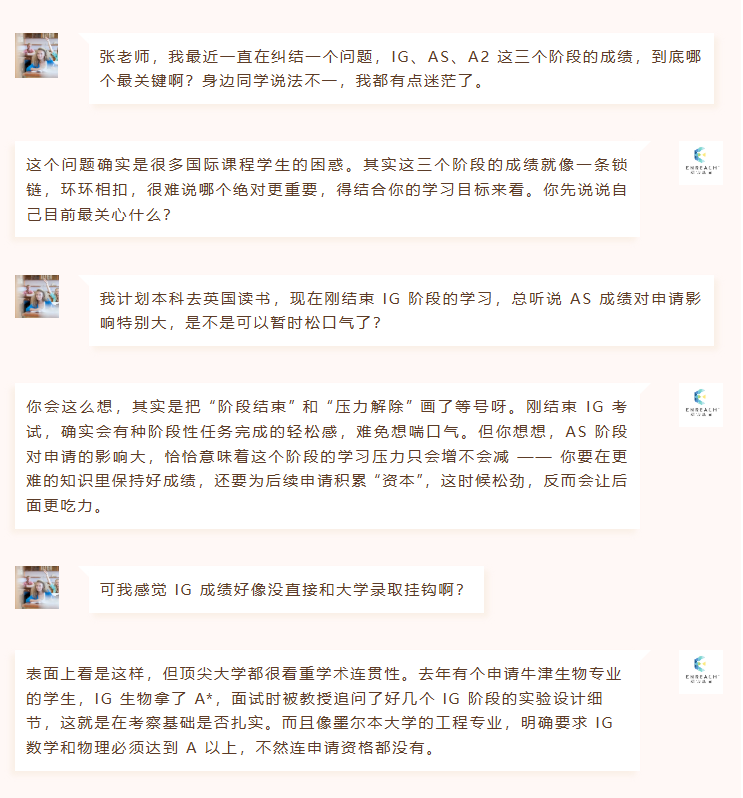 前两天,开学将进入高二学年的小Yu同学,对于IG/AS/A2阶段的学科成绩重要性,有一些疑问,在与顾问老师交流后,得到了解答。小编也将他们的对话给大家进行一个分享。