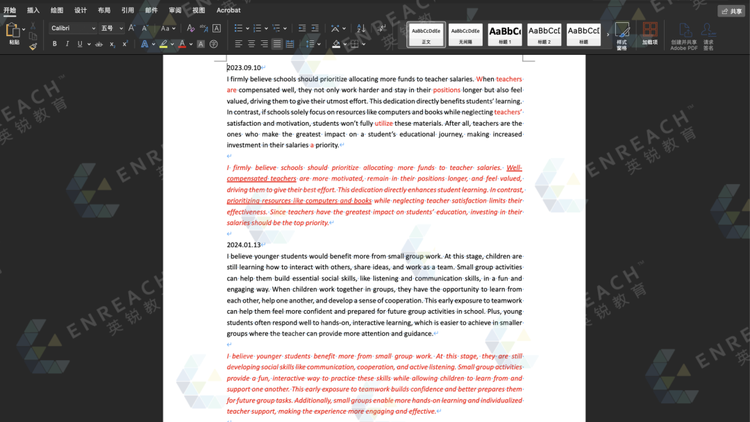 当然,老师也会耐心批改我的写作作业,找到其中不到的搭配,语法小错误。也会鼓励我多多积累一些地道的表达词组来扩充自己的写作资料。我从一开始写不满300词,到现在能在25分钟内写出结构完整、表达准确的学术讨论。