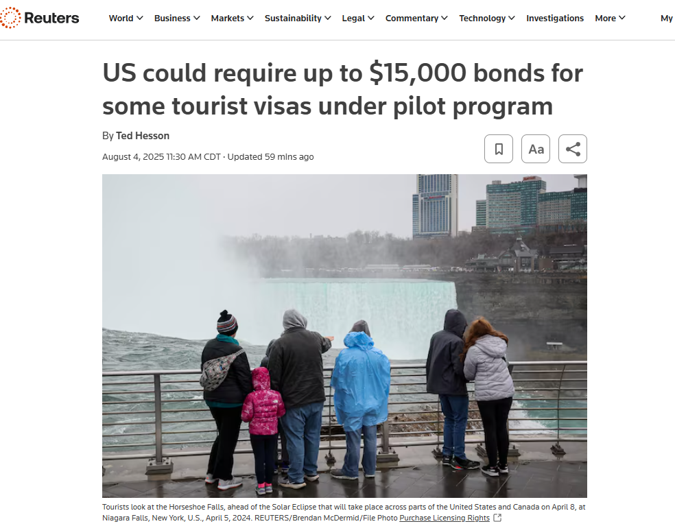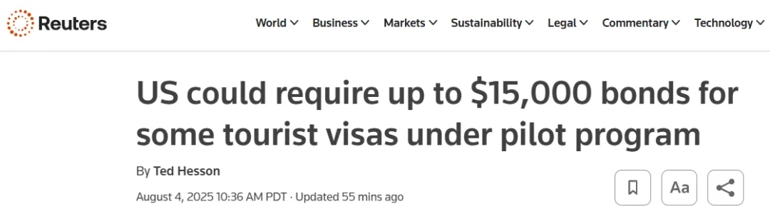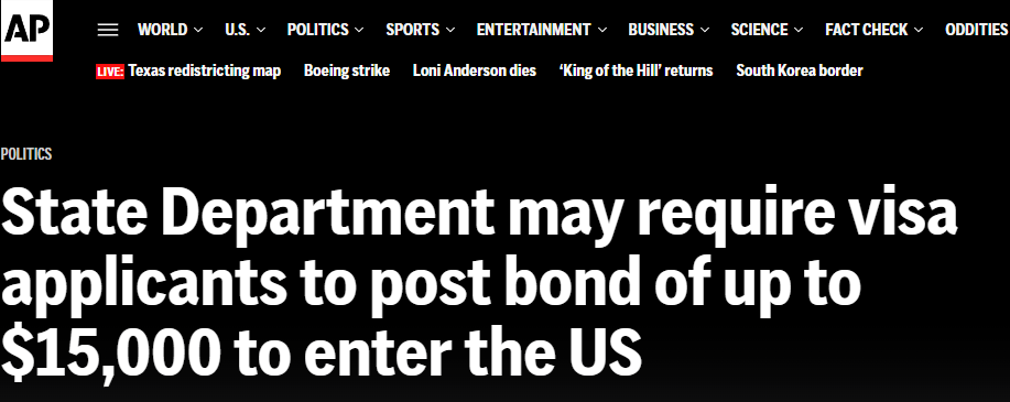根据8月4日周一发布的联邦政府公告,美国即将在两周内启动一项签证担保金试点计划,对部分旅游和商务签证(B-1/B-2)申请人要求缴纳最高达1.5万美元的保证金,旨在打击签证逾期滞留行为。