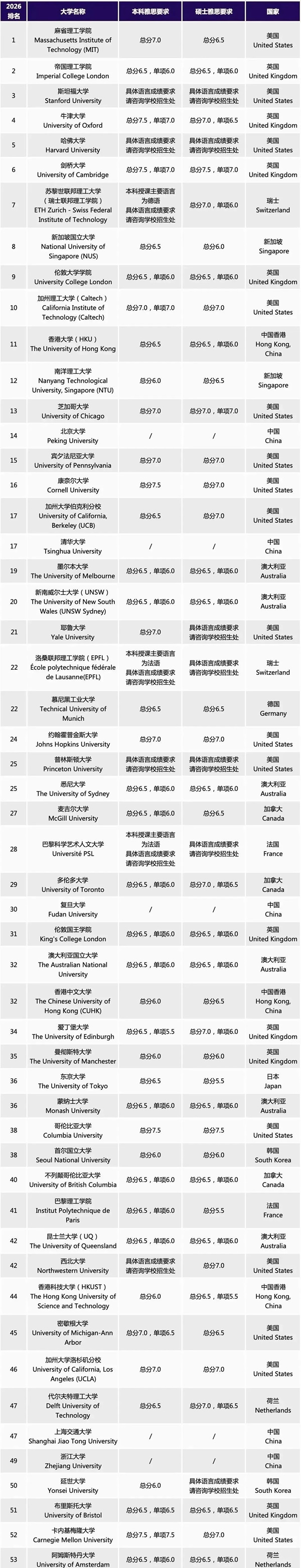 2026 QS世界大学TOP100对雅思成绩要求
