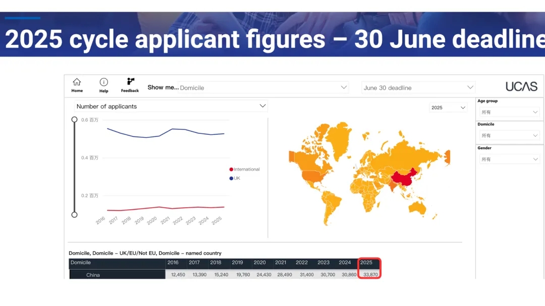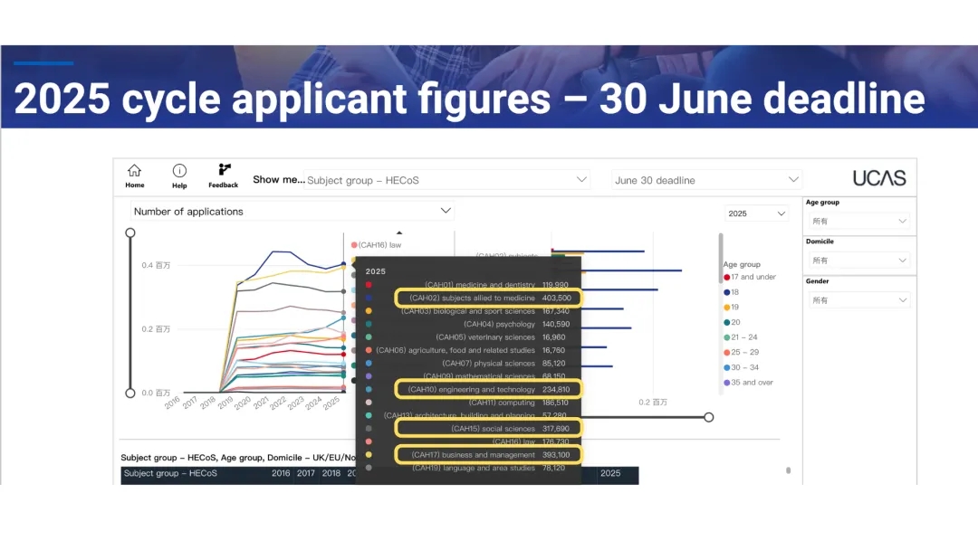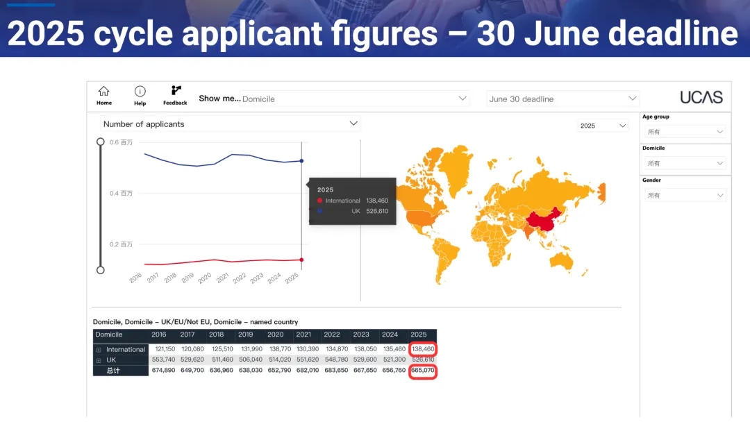 根据英国大学和招生服务中心UCAS(Universities and Colleges Admissions Service )发布的最新2025英国本科招生数据,以下两个趋势需大家重点关注: