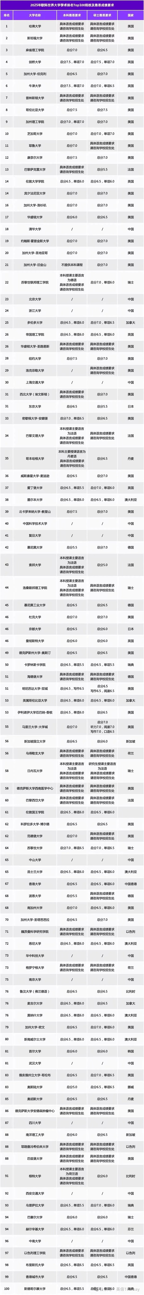 为了让考鸭们少走弯路,我们整理了2025年软科世界大学学术排名Top100院校及雅思成绩要求,快来看看你的梦校分数是多少!