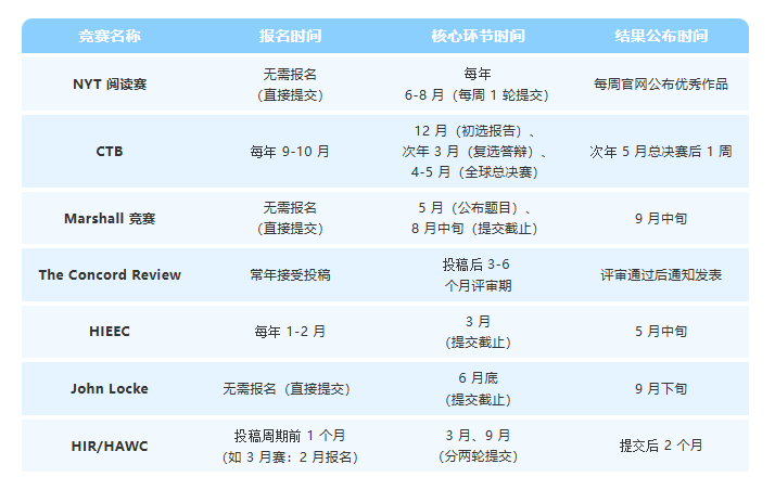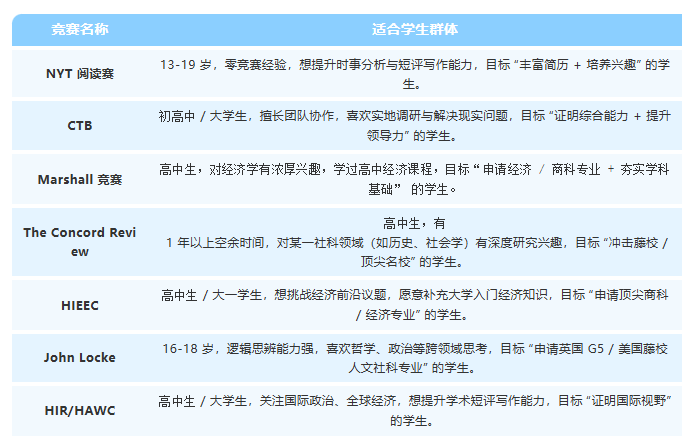 如果你是社科新手,从 NYT 阅读赛或 HIR/HAWC 起步,用短期备赛积累信心;若擅长团队协作,CTB 能让你在实践中提升综合能力;钟情经济学,Marshall 和 HIEEC 是专项突破的选择;思辨能力突出,John Locke 能展现思想深度;追求顶尖学术,The Concord Review 则是证明研究实力的终极舞台。