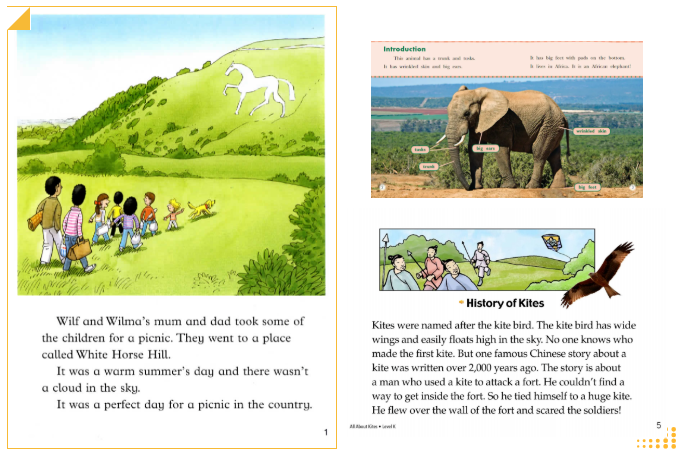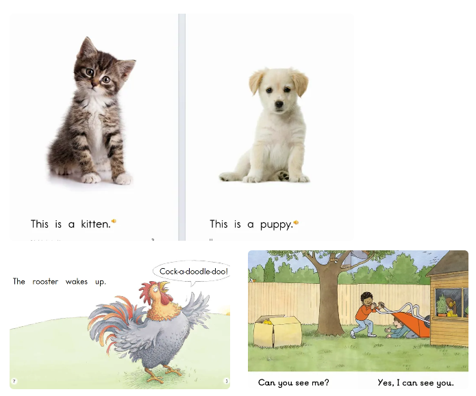 海尼曼则开创了 "虚构与非虚构动态平衡" 模式:低级别(GK-G1)保持 60% 虚构故事与 40% 科普内容的比例,随着级别升高逐渐调整为 40% 虚构与 60% 非虚构。这种设计暗合儿童认知发展规律 —— 低龄阶段需要故事建立阅读兴趣,而学龄后则需要更多信息类文本支持学科学习。其非虚构内容采用高清写实图片,如《At the Farm》中真实的动物形象,比卡通插图更能帮助孩子建立 "语言 - 实物" 的直接对应关系。