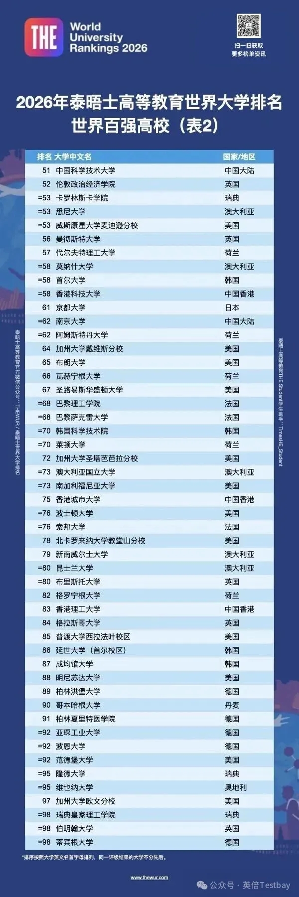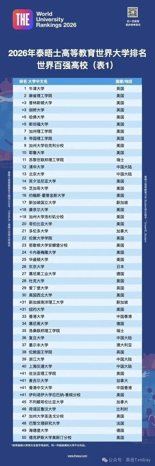 就在昨日,2026THE泰晤士高等教育世界大学排名发布!作为留学风向标的榜单之一,今年的泰晤士又有哪些变化?接下来,小编就为大家详细解读一下今年最新排名榜单,宝子们看过来喽
