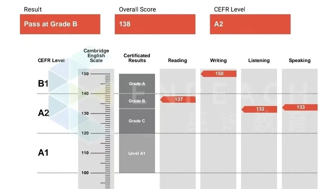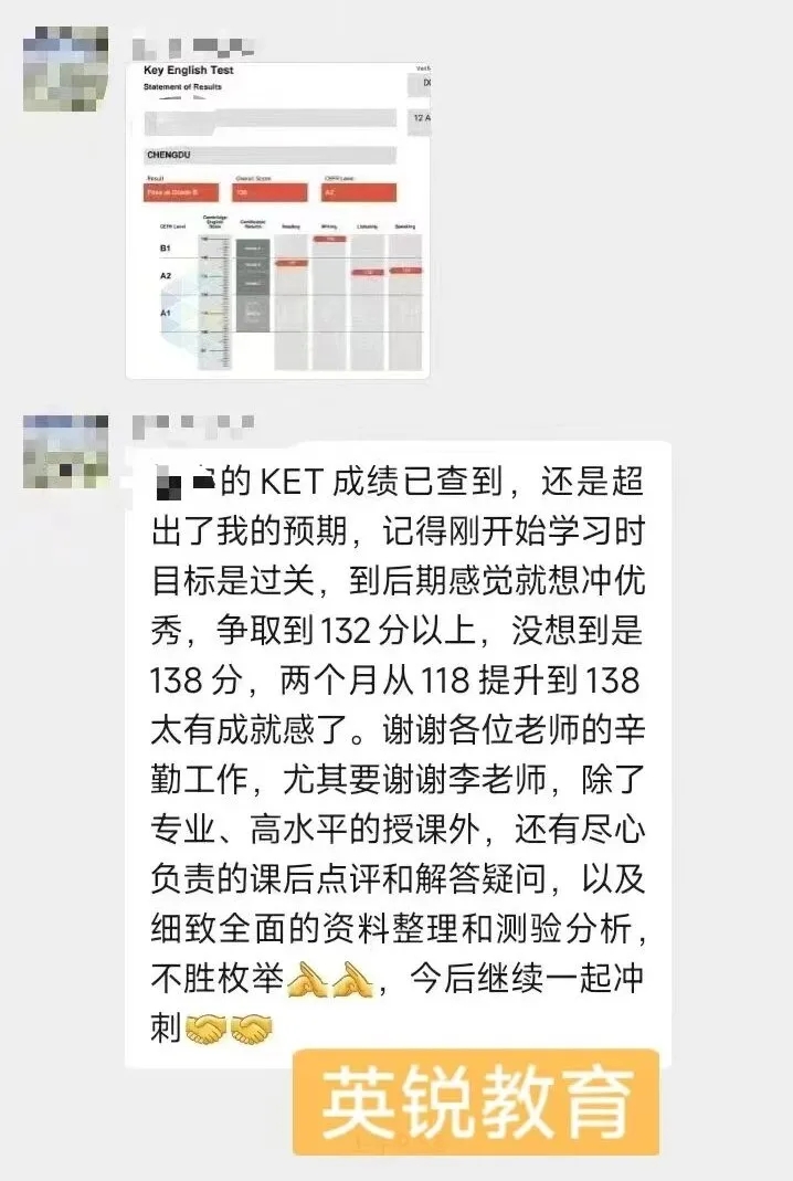 “L 的 KET 成绩已查到,还是超出了我的预期!记得刚开始学习时目标是过关,到后期感觉就想冲优秀,争取到 132 分以上,没想到直接考了 138 分!两个月从 118 提升到 138,太有成就感了!”