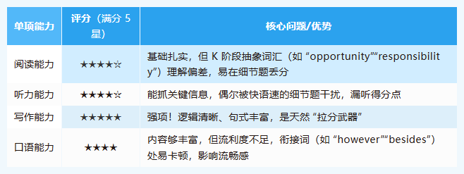 很多孩子备考效率低,问题出在 “不知道自己哪里弱”。所以在给 L 同学规划课程前,我们先安排了校区线下真题模考,不仅测出基础分,更把四个单项的 “强弱项” 拆解得明明白白: