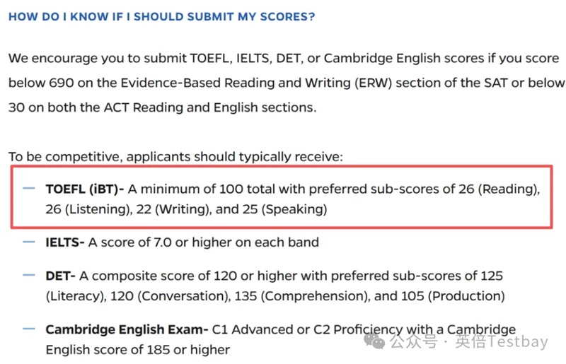 可以看出,美国名校对语言能力的要求正在逐年提升,不仅要求总分,单项小分也同样重视。所以建议同学们尽早制定备考计划,争取考出高于最低线以上的成绩,增强申请的竞争力。