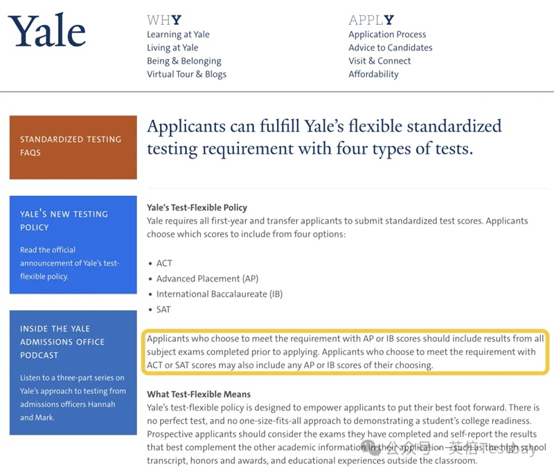 自2025Fall申请季开始,耶鲁要求申请者如果选择用AP或IB成绩替代SAT/ACT,必须提交所有已考科目的成绩,不得隐藏任何一门!更全面地评估学生的学术准备情况。