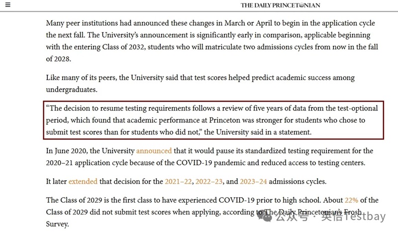 近日普林斯顿官宣:自2027-28学年起,所有本科申请者必须提交SAT或ACT成绩,结束了实施了七年的“Test-Optional”政策。