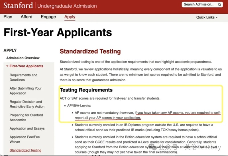 斯坦福大学:AP成绩“零隐藏”,2026秋恢复标化必交!新增规定:只要考过AP,就必须上报所有成绩!学校官网明确指出:“隐瞒成绩将影响录取决定”。