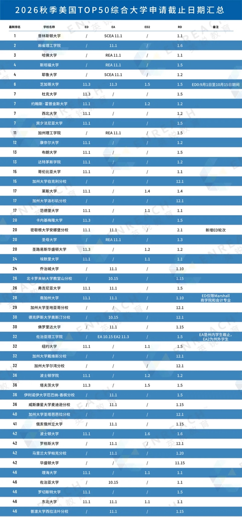 图片为美国TOP50综合大学申请截止日期