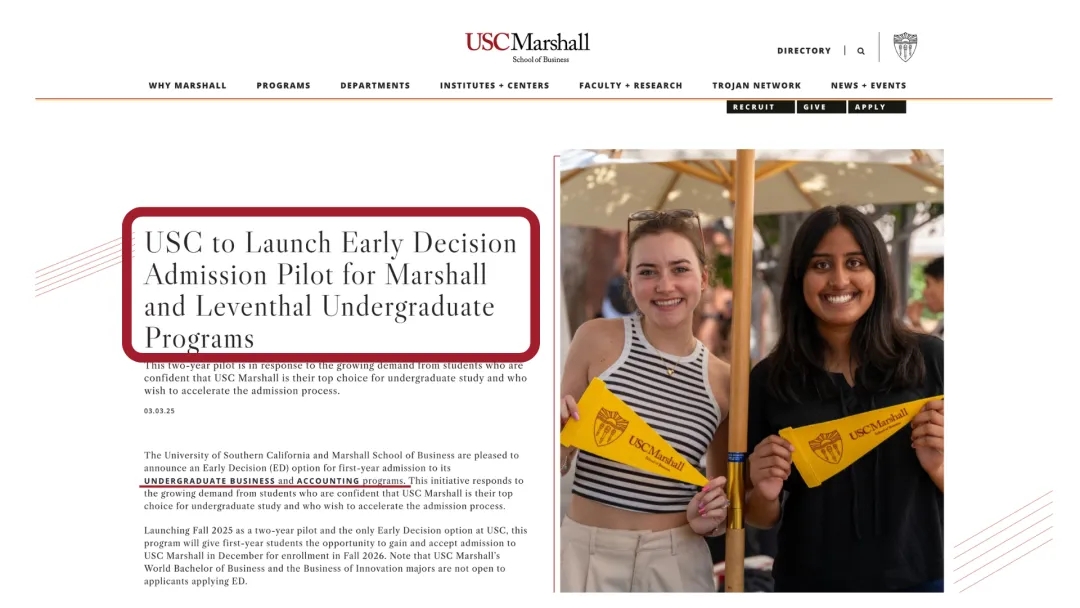 南加州大学马歇尔商学院也在2026Fall申请季首次试行ED(Early Decision),该政策仅适用于商学院旗下商科管理与会计学专业。