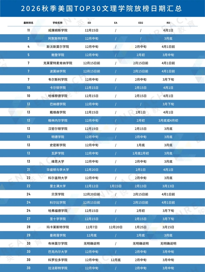 图片为美国TOP30文理学院申请放榜日期