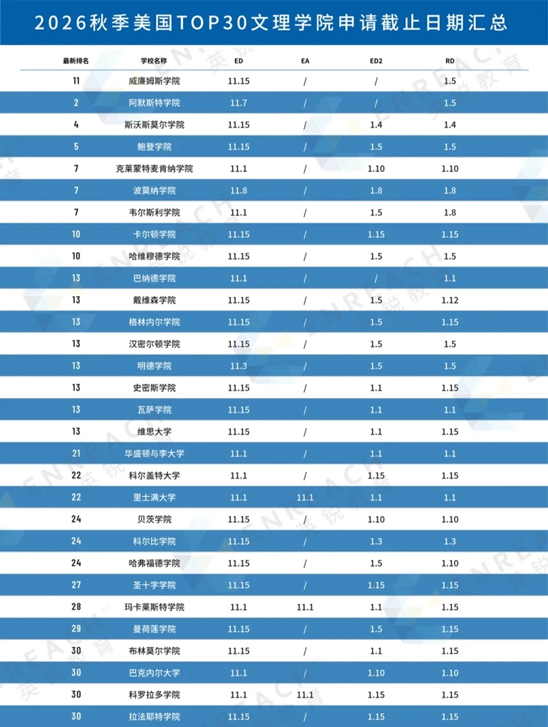 图片为美国TOP30文理学院申请截止日期