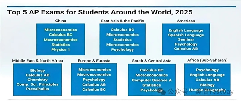 中国考生的科目偏好呈现鲜明的 “理工商科倾向”:热门科目 TOP5 依次为:微观经济学、微积分 BC、宏观经济学、统计学、物理1。