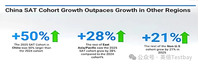 2025年中国SAT考生人数较2024年增长50%,这一增速远超东亚及太平洋地区(28%)、美国以外全球平均(21%),几乎是全球增速的2倍,反映出中国学生对SAT考试的重视程度持续提升。