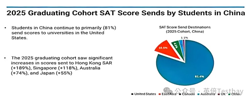 SAT送分:仅将SAT成绩送往非美国大学的国际学生比例,五年内从23%升至41%。2025年中国SAT考生成绩送达总量,较2024年增长56%,较2023年更是暴涨186%,覆盖30余个国家、650余所大学。其中,送往中国香港、新加坡、澳大利亚、日本的成绩人数增长最快,亚洲院校成为新的 “热门接收地”。