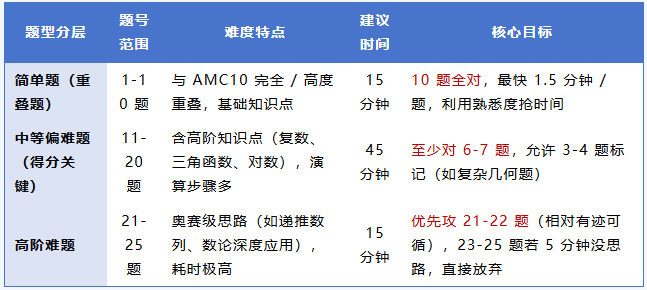 AMC12:前 15 题需快速作答(利用与 AMC10 的重叠题抢时间),预留 30 分钟攻坚后 10 题的高阶考点(如复数几何意义、递推数列)。