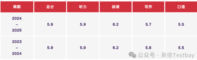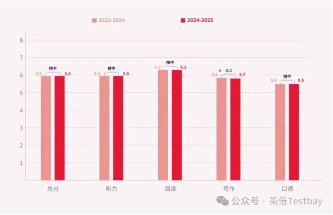 2024–2025年度,中国大陆地区学术类雅思考生成绩整体保持稳步发展的趋势。报告显示,中国大陆地区学术类雅思考生的总分均值为5.9分,与上一年度基本持平。
