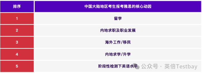 “海外留学”仍是中国大陆地区考生报考雅思的核心动因,在“多国联申”的主流申请趋势下雅思考试成为考生首选的语言能力考试之一。