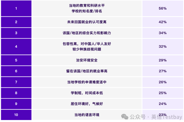 在选择留学目的地的考量因素中,当地的教育和科研水平、学校知名度与排名稳居首位(56%),其次是未来回国就业认可度(42%)和国家或地区的综合实力(34%)。此外,治安环境安全(29%)、对中国学生的友好程度(32%)以及留学后当地就业率(27%)等现实因素的权重也在持续提升。这一趋势表明,中国大陆地区雅思考生在规划留学时不再一味追求“排名至上”,而是更加注重长期价值与安全保障的平衡,展现出日趋理性、成熟的国际教育观。