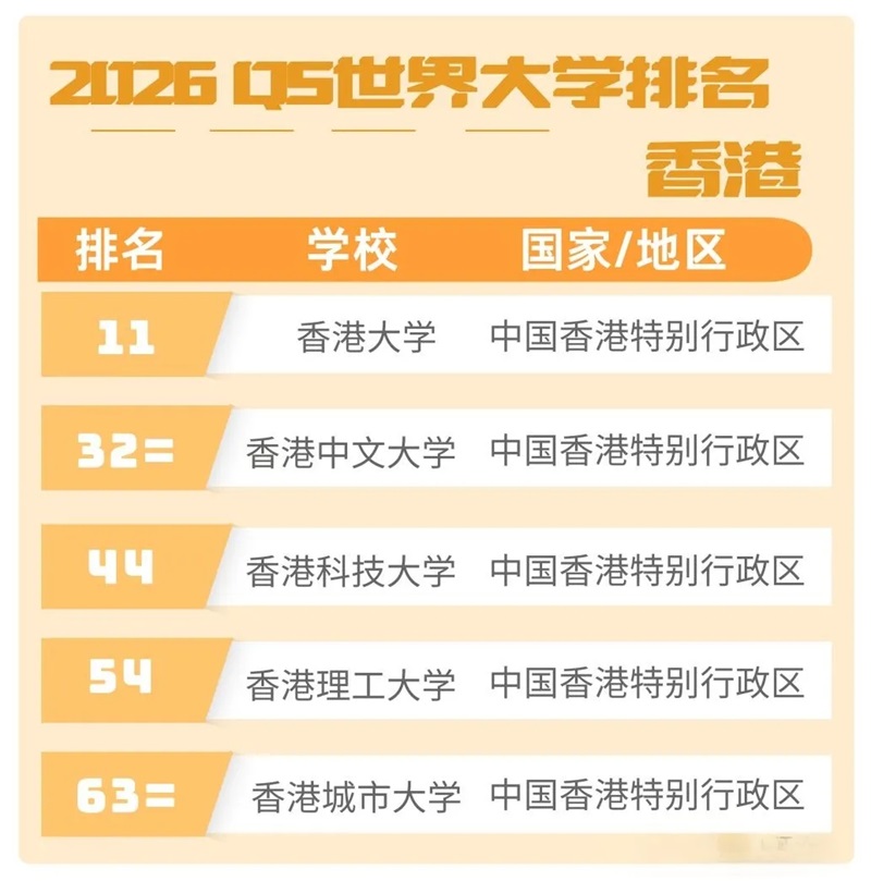 在最新发布的2026 QS 世界大学排名中,港八大不仅全员上榜,且排名也呈上升趋势。其中有5所列席世界100强;3所为世界50强。而香港大学更是创历史位列第11,稳坐亚洲第2。
