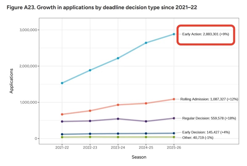滚动录取(Rolling Admission):申请量突破百万大关,涨幅高达12%,显示出其灵活性和持续接收申请的特点,吸引了大量希望尽早获得录取结果的申请者。
