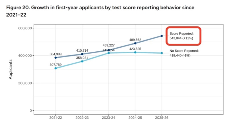 在本申请季中,标化成绩的强势回归成为另一大显著趋势。数据显示,提交标化成绩的申请人数突破54万大关,同比大幅增长11%;与此同时,未提交标化成绩的申请人数则出现五年来首次下滑。