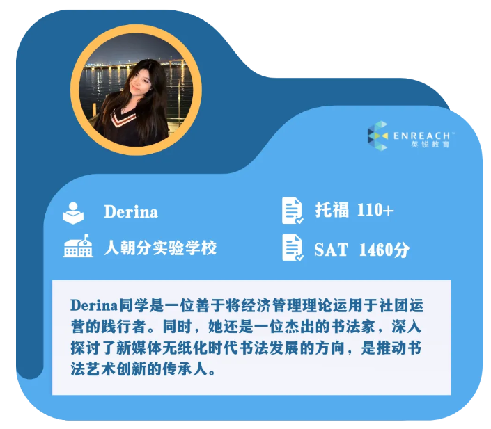 Derina不是典型学霸。事实上,她的整个升学过程历经坎坷和磨难。Derina的标化开始很早,但是从101到111,走过了差不多一年半的时光。望山跑死马,是这段经历最真实的写照。很多同学和家长都希望尽早和托福分手,尤其是达到100左右之后。但实际情况却未必那么顺从心意。所以,对于大部分普娃来说,做好打持久战的思想准备是必要的。Derina和家长做得最明智的选择是听从我们的规划建议,一直保持多线程作战,而不是一味地死磕某一项任务。和大多数同学一样,她需要投入很多时间精力准备AL大考,不断地刷标化,但是她并没有因此放弃必做的学术和非学术活动。我们针对她的特点,充分考虑到执行的可实施性,为她精准安排了最适合也是最高效的活动内容。Derina既没有好高骛远,也没有因为善小而不为,她按时按量地把所有任务都完成好了。再配上她全A的GPA、4A*的AL大考和达标的标化,这些都最终成就了她英国LSE、美国纽约大学和加州圣地亚分校的录取。选择决定成败。对于非典型学霸来说,坚定自己的目标和方向,听从专业的建议并有效地执行,无论当下的艰难困苦都坚持不懈,最终都有可能牵手自己的梦校。