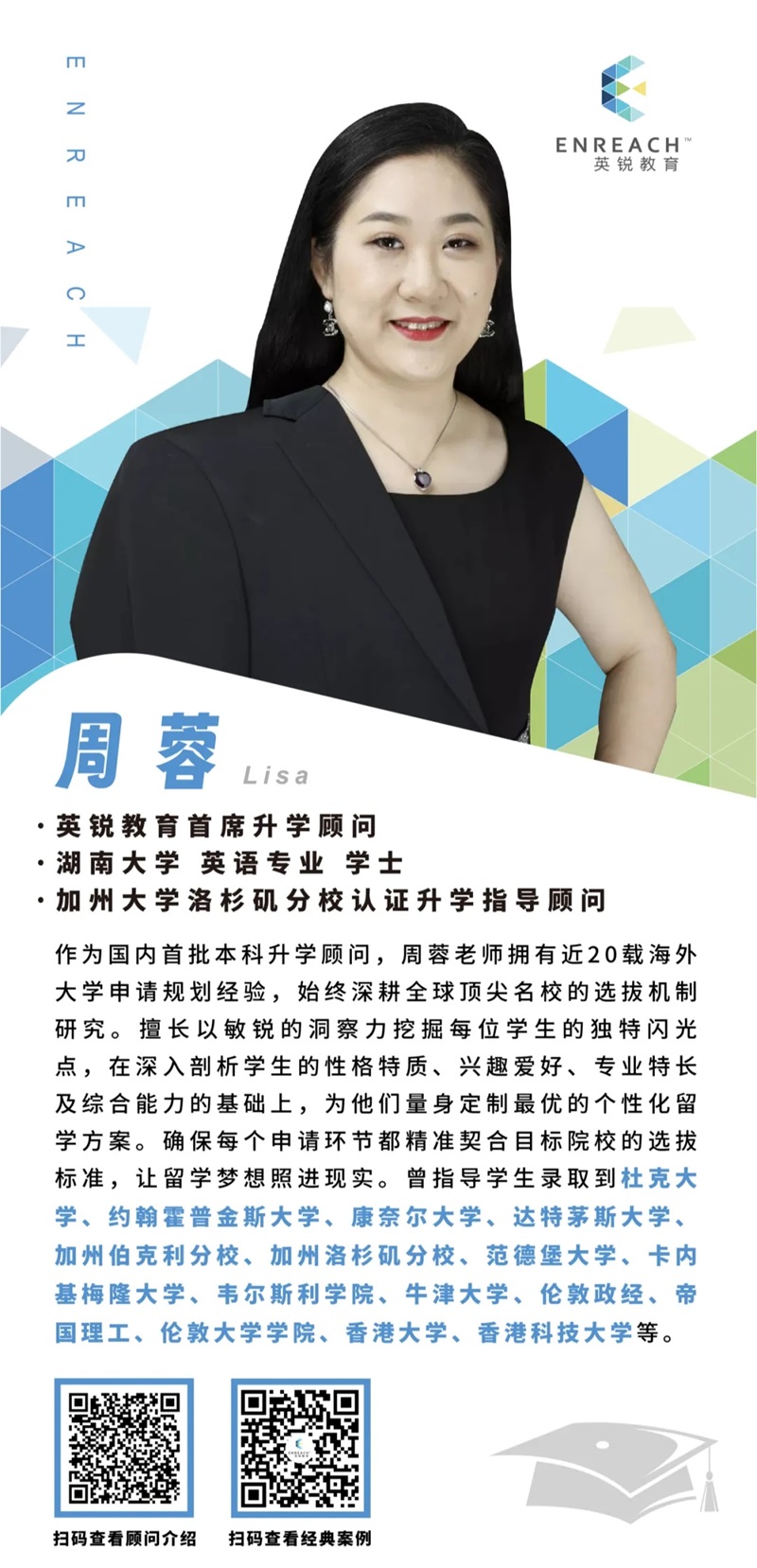 周蓉老师是一位非常认真、负责且极具耐心的老师。在整个申请过程中,无论我提出什么问题,她总是及时且细致地回应。当我遇到压力或焦虑时,她不仅提供专业的建议,还会给我情绪上的鼓励和支持。她帮助我合理规划时间,梳理申请材料,甚至在文书细节上逐字推敲。我能感受到她真正的关心和投入,非常幸运能在申请路上遇到这样一位老师。