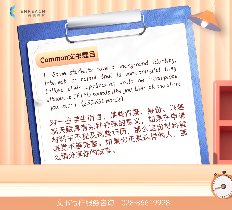 此题是 Common Application 历年来最传统的题目之一,也是大家最常选申请短文题目,之所以广受大家欢迎是因为题目本身给大家提供许多选择,你可以写背景、身份、兴趣或才能,大家可以结合自身经历广泛取材,通过你的故事学校可以了解你的性格特点、不为人知的经历以及独树一帜的才能天赋,为学校呈现一个与众不同的自己。