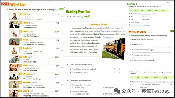 (1) 按词频由高到低排序,前面的词汇简单易懂,且有配套的图片,英文释义和例句比较生活化,例句可以直接运用在口语和写作中,非常实用。每个单元配套的文章故事描述覆盖了本单元所有单词,句式多以简单句为主,故事短小而精炼,适合小朋友认知。