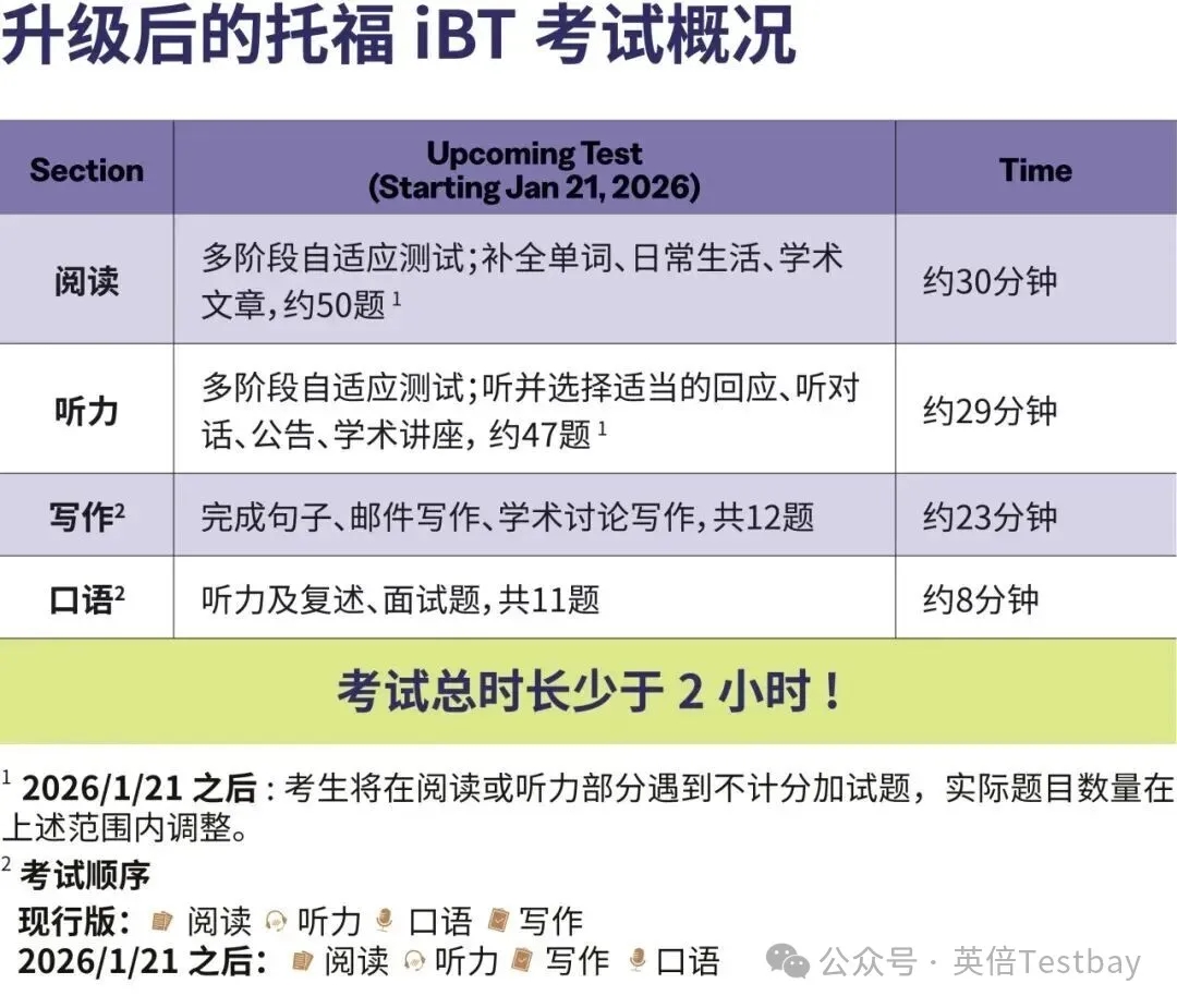 2026年1月21日起,托福iBT将迎来全面升级——更贴近真实学术与生活场景、引入自适应出题机制、对接CEFR国际标准、最快考后72小时出分!旨在为每位考生提供更公平、灵活、高效的个性化考试体验。