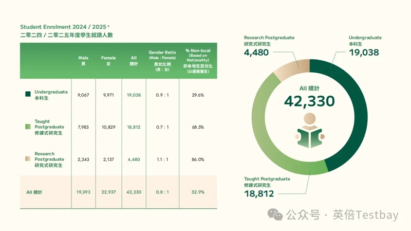 本科生生源地分布中,除内地外,香港本地、国际生(如东南亚、欧美)占比分别为25%和9.8%,生源结构多元。