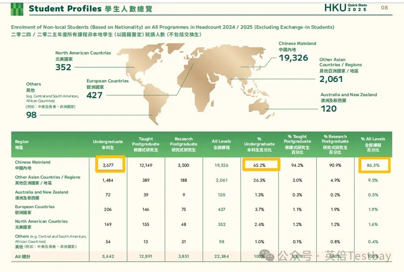 近日,香港大学发布了《2025年度招生报告》,涵盖了各专业院系学校入学情况、本科生生源地分布及占比、毕业生就业统计等各方面内容,内地本科生占比创新高,达65.2%,成为港大本科生的主要来源地,反映其在内地学生中的持续吸引力。