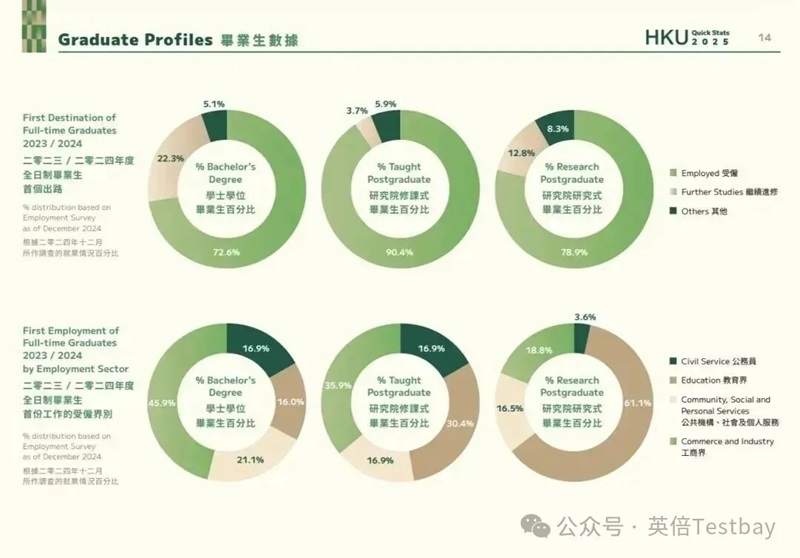 投身职场的毕业生遍布各行各业,包括工商企业、公共部门、社会服务、教育领域等。以上数据不仅显示了港大学子的高竞争力,也表明他们在职场上的多样化发展。