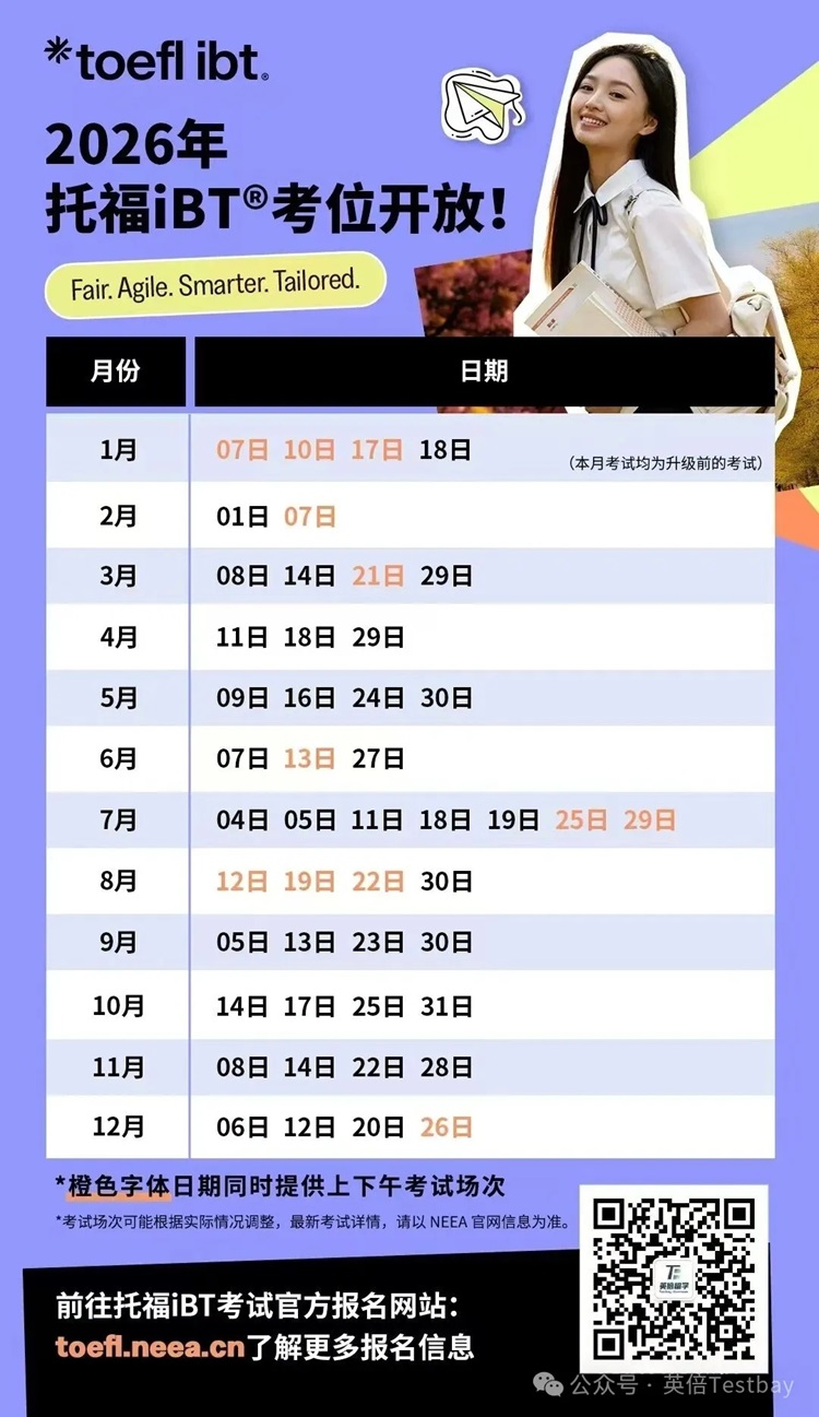 2026年2月1日起,托福iBT将迎来全面升级的首场考试——更贴近真实学术与生活场景、引入自适应出题机制、对接CEFR国际标准、最快考后72小时出分!旨在为每位考生提供更公平、灵活、高效的个性化考试体验。