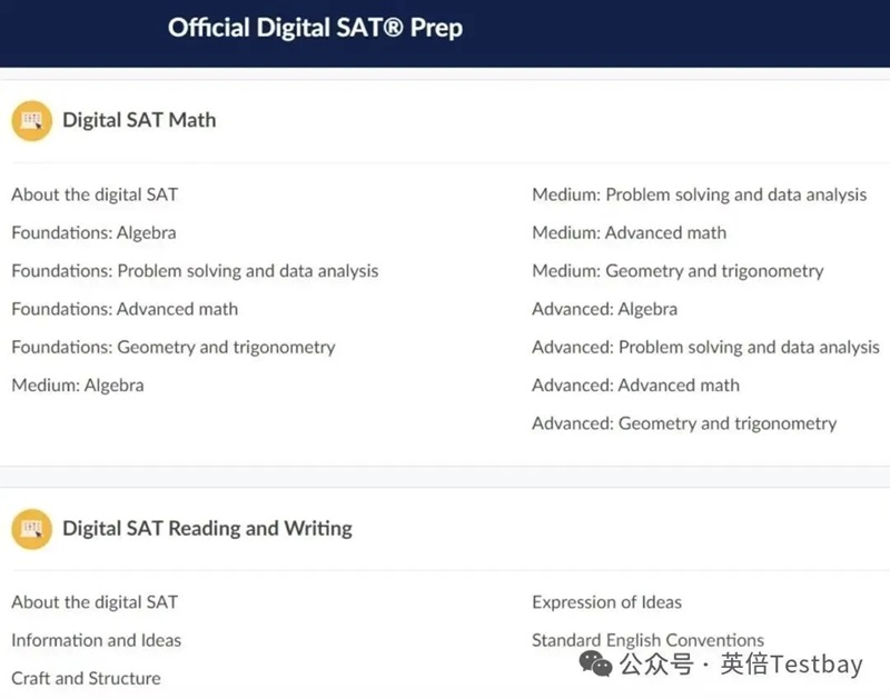 CB官方授权给可汗学院,联合出品了一些机考SAT的分类练习资料。学生可以登录可汗学院进行SAT机考模拟题的练习,并附有答案的分析和解释。除了模拟题,可汗学院还为学生提供一系列高质量的SAT备考练习和视频课程,帮助学生巩固知识点、提高技能,熟悉机考流程。这些材料整体题目比较简单,适合刚接触SAT的同学们练习。