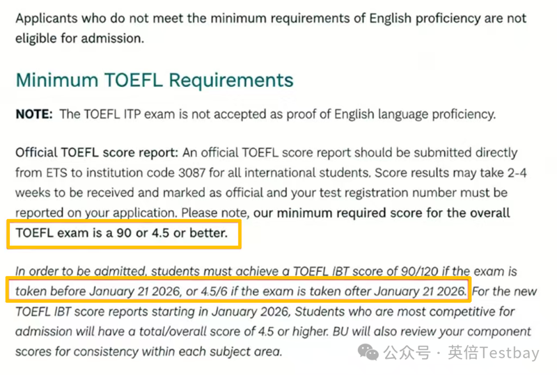 分阶段明确要求:2026年1月前参加的旧版托福,最低要求90分;2026年1月及之后参加的新版托福,最低要求4.5分;2026年1月21日之后的新版托福,最低要求提升至5分。4.5分对应旧版托福84-97分,整体要求与改革前基本持平。