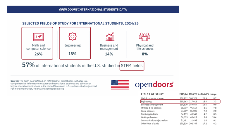 但是,因为竞争激烈,行业内流传着这样一句话:“美本工程大类申请几乎无保底校”。由美国官方背书的Opendoors 门户开放报告也给出工程大类专业是国际留学生选择排名第二位的专业,人数为217,016人,占比18%;排在第一位的则是与工程大类紧密关联学科数学和计算机工程,占比26%,这两大类都属于热门STEM专业。由于毕业工签政策等原因,吸引了全世界范围内留学生家庭的关注,门户报告也给出57%的国际留学生来美选择学习STEM领域!