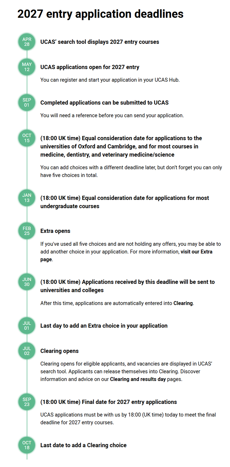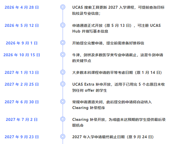 UCAS 官方明确 27Fall 申请时间整体提前 1 天,看似微小的变动,实则考验着家庭的时间规划能力。以下是精准对应 UCAS 官方的完整时间轴,建议家长收藏保存,避免错过关键节点(所有截止时间均为英国时间 18:00):