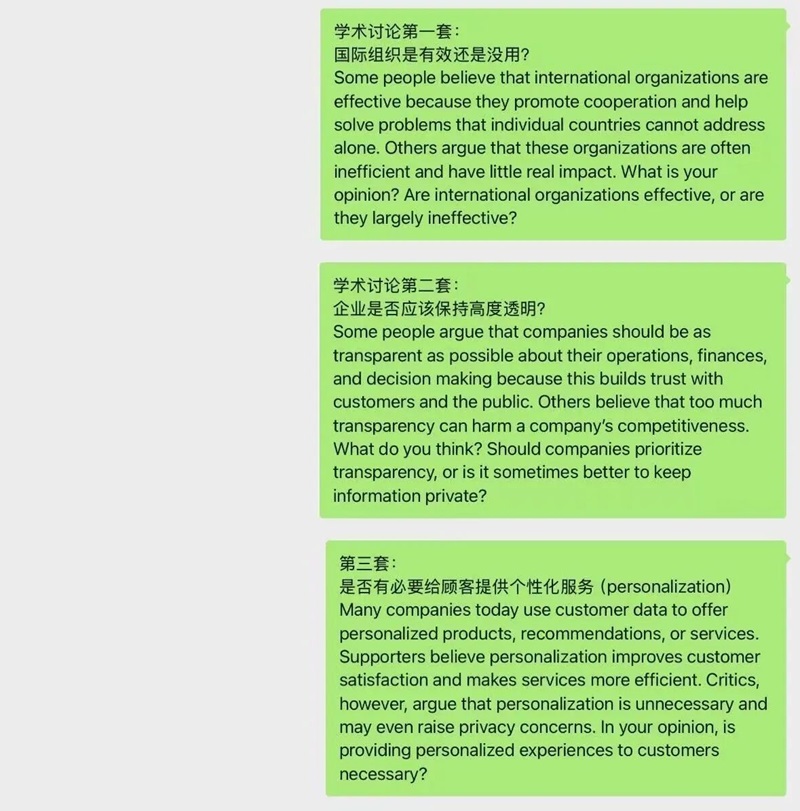 • 学术讨论:已收集 3 类话题,包括 “国际组织是否有效”“企业透明度”“个性化服务是否为优质营销方式”,整体难度较旧版有所提升,需强化逻辑论证能力。