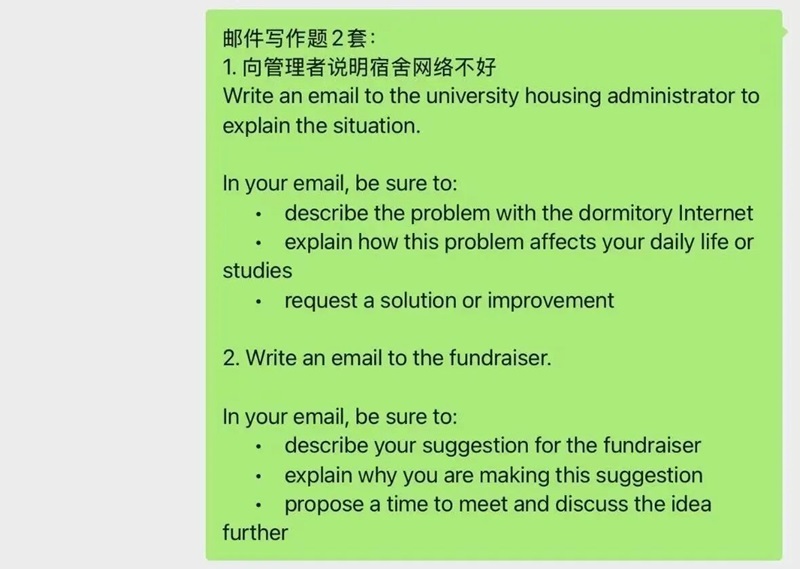 • 邮件写作:首考聚焦 “设施报修类”(如宿舍网络故障)和 “公益活动规划”,属于高频主流话题。答题关键是 “有限展开”—— 细节到位但不冗余,避免临时创新导致表达失分。